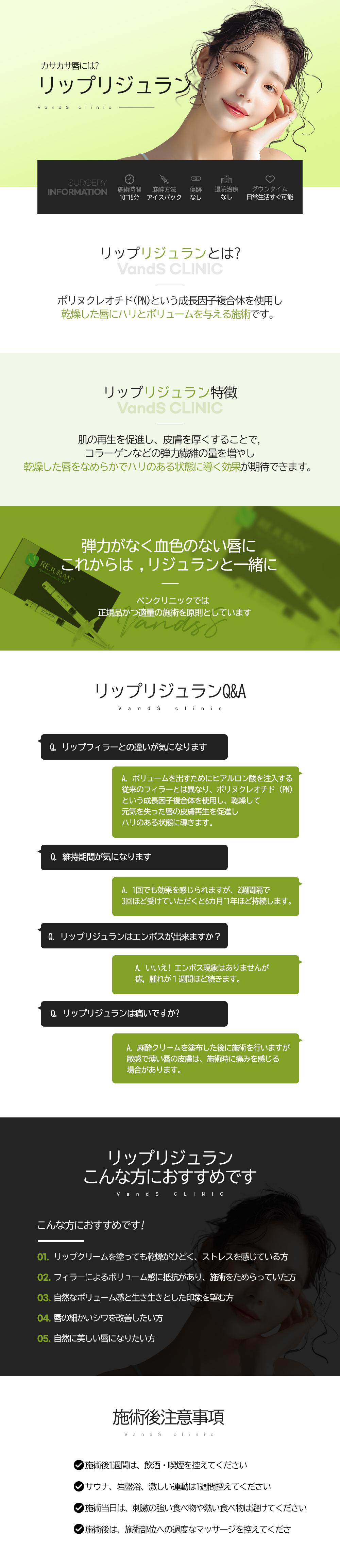 唇・手の甲リジュランヒーラーは、生体適合物質であるポリヌクレオチド(PN、polynucleotide)という成長因子複合体です。 成長因子複合体により、薄くたるんだ皮膚の表皮層と真皮層を根本から再生し、唇や手の甲の皮膚を健康でハリのある状態へ導く施術です。