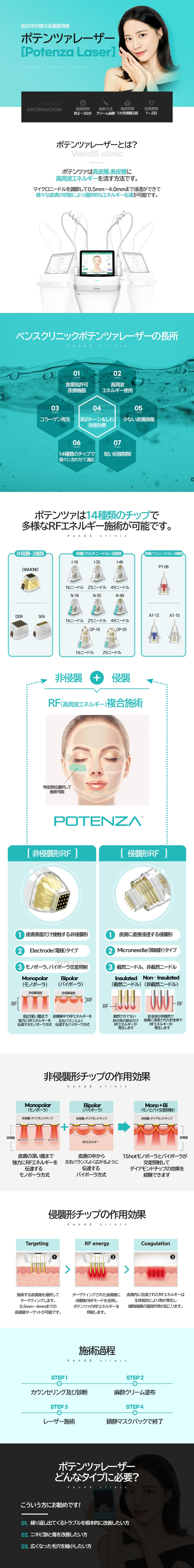 ポテンツァレーザーは皮膚の真皮層にマイクロニードルを挿入し、RF(高周波)エネルギーを 流すことで、表皮のダメージを抑えながらコラーゲン再生を促進し、肌のキメを整える施術です。 さまざまなマイクロニードルチップを使用することで、毛穴・傷跡・ニキビ・赤ら顔・紅潮など、 肌の悩みに合わせた治療が可能で、さらに小じわや肌のハリ改善効果も期待できます。